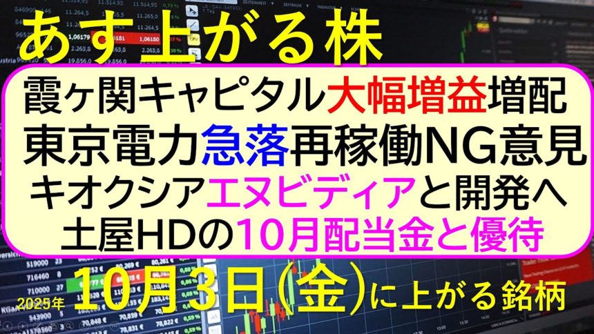 あす上がる株 2025年10月3日(金)に上がる銘柄。霞ヶ関キャピタル大幅増益増配。東京電力急落再稼働NG意見。キオクシアエヌビディアと開発。土屋配当~最新の日本株情報。高配当株の株価やデイトレ情報~