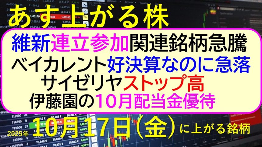 維新連立参加、関連銘柄急騰。ベイカレント好決算なのに急落。サイゼリヤ、ストップ高。伊藤園の10月配当金優待。