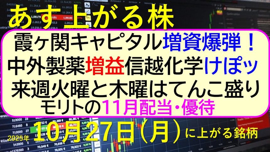 霞ヶ関キャピタル増資爆弾!中外製薬増益。信越化学けぽッ。来週火曜と木曜はてんこ盛り。モリトの11月配当・優待
