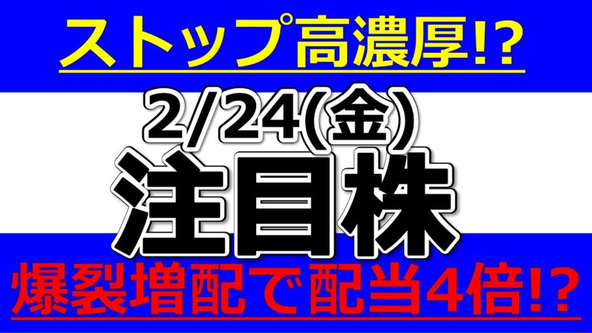 ストップ高濃厚!?爆裂増配で配当4倍のあの株!?【2月24日(金)の注目銘柄まとめ】本日の株式相場振り返りと明日の注目銘柄・注目株・好材料・サプライズ決算を解説、株式投資の参考に