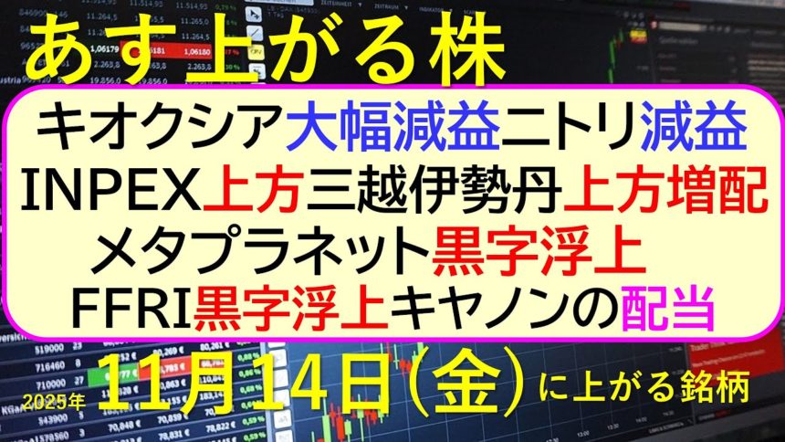 キオクシア大幅減益。ニトリ減益。INPEX上方。三越伊勢丹上方増配。メタプラネット黒字浮上。FFRI黒字浮上。キヤノンの配当
