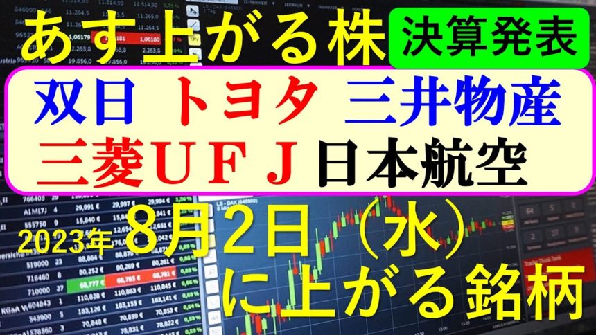 今日の引け後に出た材料で、あす8/2(水)に期待できる銘柄。株式投資とデイトレ情報。決算スケジュールの時刻と狙いどころ。本日のストップ高、ストップ安。IPOの新規上場銘柄とスケジュール。経済カレンダーも掲載。あすのデイトレ銘柄候補10選。7月の高配当銘柄。7月8月のIPO新規上場銘柄。半導体銘柄と生成AI銘柄。最新の半導体関連銘柄と生成AI株、商社株。トヨタ、三菱UFJ、日本航空(JAL)、三井物産、双日、メルカリの決算速報についてもお話しいたします。
