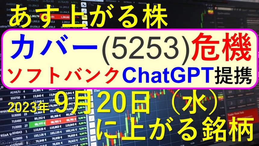 あす上がる株 2023年9月20日(水)に上がる銘柄 ~最新の日本株での株式投資のお話です。初心者でも! カバー、ソフトバンク、トヨタ~