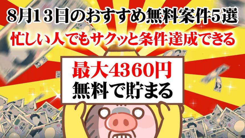 【ポイ活】10分あればOK!ポイ活の時間がなくてもサクッと稼げる!8月13日のおすすめ無料案件5選をまとめました!【お得ポイ活情報/モッピー】